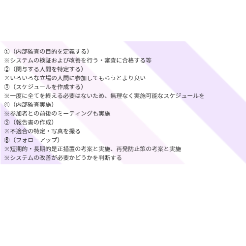 文書でよく目にするものに、「少なくとも年に1回行わなければならない」という言葉があるからでしょうか?間違ってほしくないのが、「○月の1週間で内部監査を行おう。」「監査前に2~3日内部監査期間を設けよう。」こういった認識をしてしまうことです。
